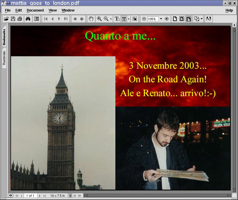 This is the last slide of a popular astronomy talk I gave back in Italy a few days before leaving for London. In English it would sound more or less like "As for me... November 3 2003... On the Road Again! Ale and Renato... I'm coming!:-)
